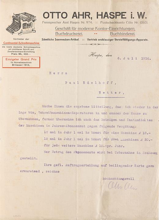 Brief der Schreibmaschinenhandlung Otto Ahr, Haspe adressiert an Herrn Edelhoff, Wetter; datiert 06.07.1916 Maschinenschrift, unterschrieben; Briefbogen mit Wasserzeichen "Otto Ahr Buchdruckerei"
