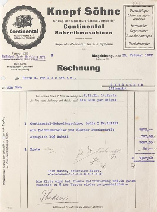 Rechnung Nr. 238 der Schreibmaschinenhandlung Knopf Söhne, Magdeburg adressiert an Herrn von Destinon, Seehausen; datiert 28.02.1922 Maschinenschrift; Briefbogen mit Wasserzeichen "Manila Schreibmaschinen"