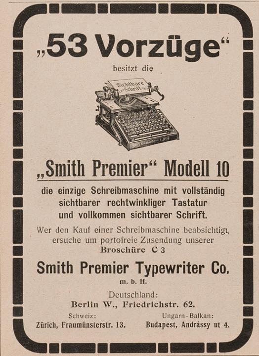 Zeitungsblatt (Fliegende Blätter) mit Werbeanzeige für Schreibmaschine Smith Premier 10 monochrom, drei Exemplare