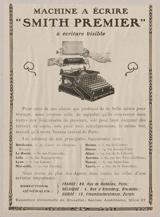 Werbeanzeige für Schreibmaschine Smith Premier 10; auf Karton geklebt monochrom