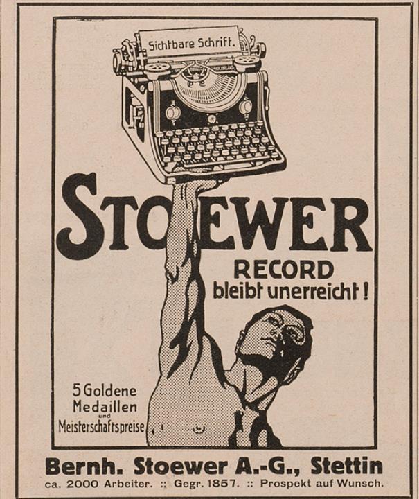 Zeitungsblatt (Fliegende Blätter) mit Werbeanzeige für Schreibmaschine Stoewer Record monochrom, drei Exemplare