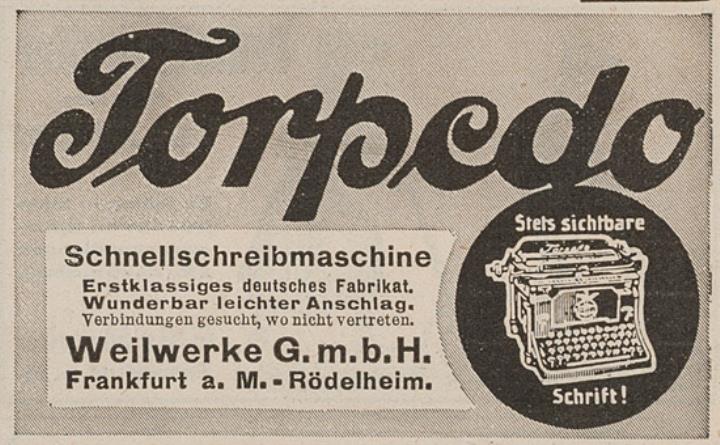Zeitungsblatt (Berliner Illustrirte Zeitung) mit Werbeanzeige für Schreibmaschine Torpedo monochrom