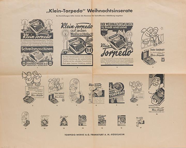 Bestellblatt mit 18 Werbeanzeigen für Schreibmaschine Klein-Torpedo monochrom