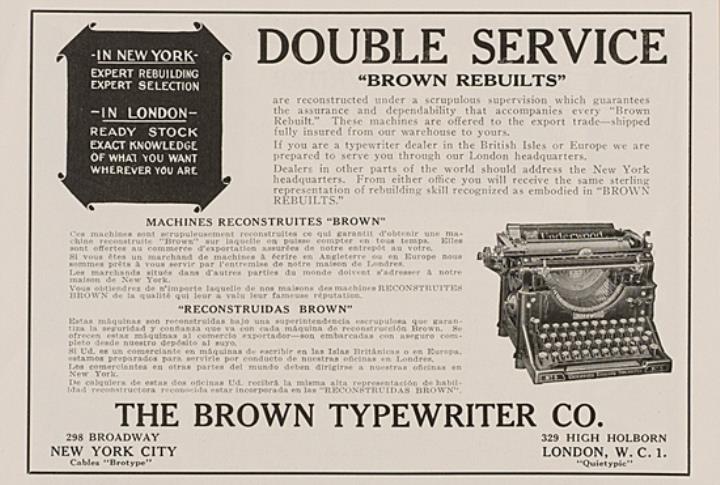 Zeitschriftenblatt mit Werbeanzeige für Schreibmaschinenhandlung The Brown Typewriter Co. monochrom