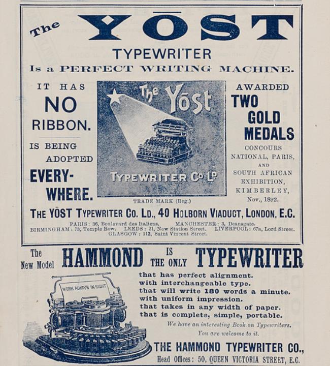Zeitungsblatt mit Werbeanzeigen für Schreibmaschine Yost und Hammond monochrom
