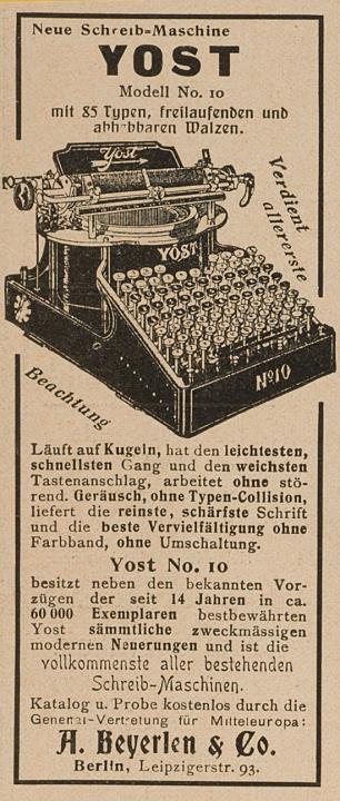 Werbeanzeige für Schreibmaschine Yost 10; auf Papier geklebt monochrom