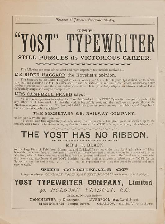 Werbeanzeige für Schreibmaschine Yost monochrom