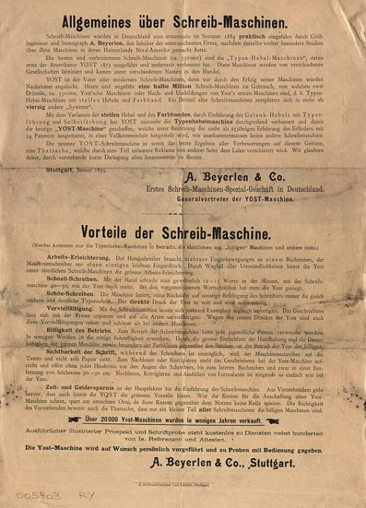 Next to literature on the history of technology, of the typewriter and the office, the Archive holds patent letters, textbooks and instruction manuals as well as historical postcards, letters, photographs and various kinds of advertising (leaflets and brochures, advertising stamps, newspaper ads, posters and signs, promotional gifts).