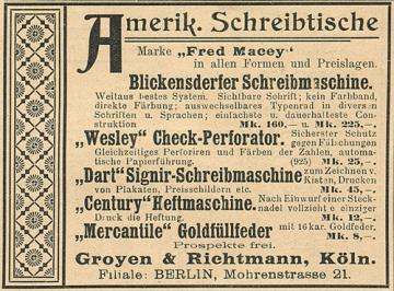 Werbeanzeige für Schreibmaschinenhandlung Groyen & Richtmann, Köln monochrom
