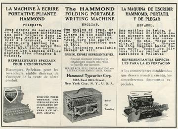 Zeitungsblatt mit Werbeanzeige dreisprachig für Schreibmaschine Hammond Folding monochrom