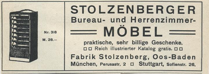 Werbeanzeige für Büromöbelhersteller Fabrik Stolzenberg, München; auf Karton geklebt monochrom