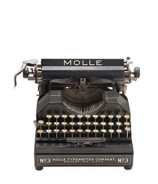 Schreibmaschine Molle Modell 3 Eigenschaften: Typenhebel, Vorderanschlag, doppelte Umschaltung, Farbband Tastatur: universal, dreireihig, 30 Schreibtasten Konstrukteur: John Molle Besonderheit: in drei Teile zerlegbar, Wagenlauf mit Kugellager