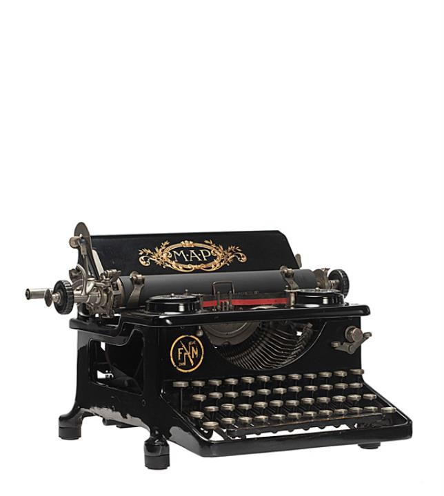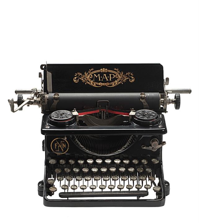 Schreibmaschine M.A.P. Modell 3 Eigenschaften: Typenhebel, Vorderanschlag, einfache Umschaltung, Farbband, Tabulator Tastatur: universal, französisch, vierreihig, 42 Schreibtasten Konstrukteur: Halcolm Gordon Ellis, Seriennummer 6568