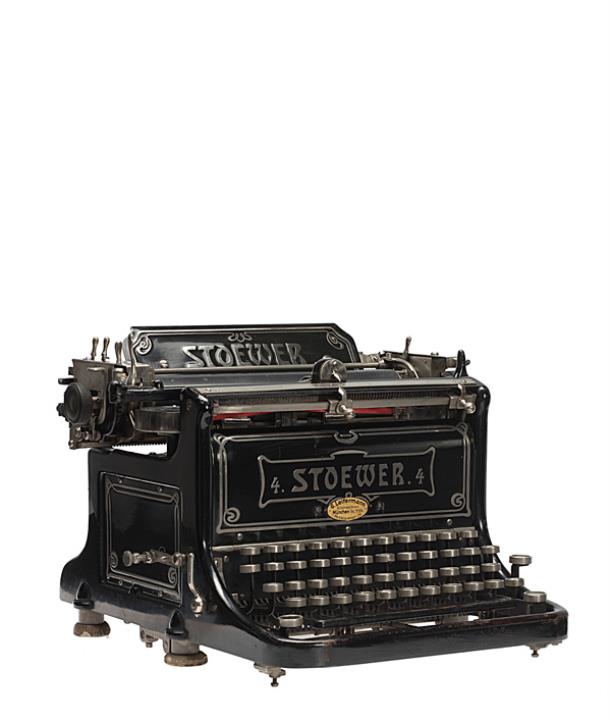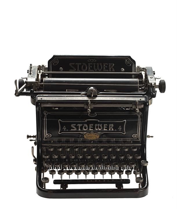 Schreibmaschine Stoewer Modell 4 Eigenschaften: Typenhebel, Vorderanschlag, einfache Umschaltung, Farbband, Tabulator, seitliche Farbband-Rückspulkurbel Tastatur: universal, vierreihig, 44 Schreibtasten Konstrukteur: Paul Grützmann, Seriennummer 8858