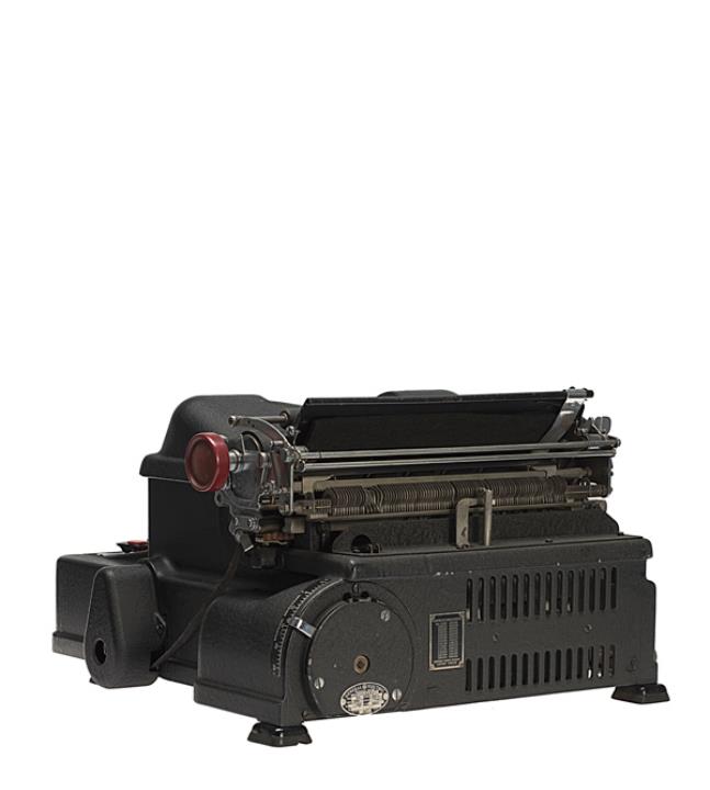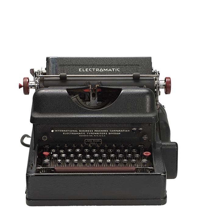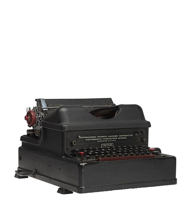 Elektrische Schreibmaschine IBM Modell Electromatic Eigenschaften: Typenhebel, Vorderanschlag, einfache Umschaltung, Farbband, Elektromotor (Gen. Electric Typ BA, 220V/D.C.) Konstrukteur: Russell G. Thompson, Seriennummer 26955