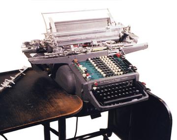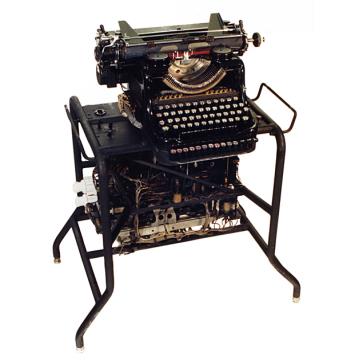 Schreibmaschine/Buchungsmaschine Burroughs Klasse 7 (Moon-Hopkins) Eigenschaften: Typenhebel, Unteranschlag, einfache Umschaltung, Farbband, Tabulator Tastatur: universal, französisch, fünfreihig, 38+20 Tasten Konstrukteur: Hubert Hopkins, Raymond G. Bower