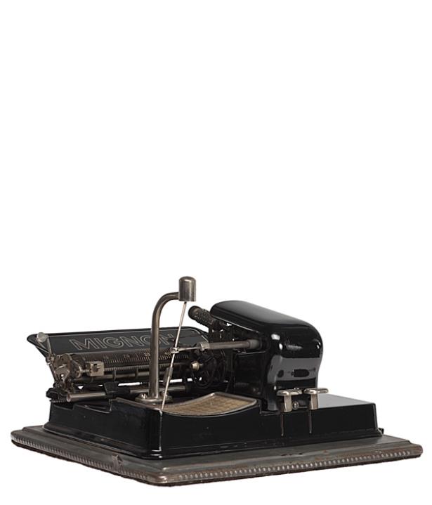 Schreibmaschine Mignon Modell 3; auf Unterboden der Metallabdeckung montiert Eigenschaften: Zeiger, Typenzylinder, Oberanschlag, Farbband, Zeichenfeld Konstrukteur: Friedrich von Hefner-Alteneck Besonderheit: austauschbarer Typenträger, Seriennummer 144237