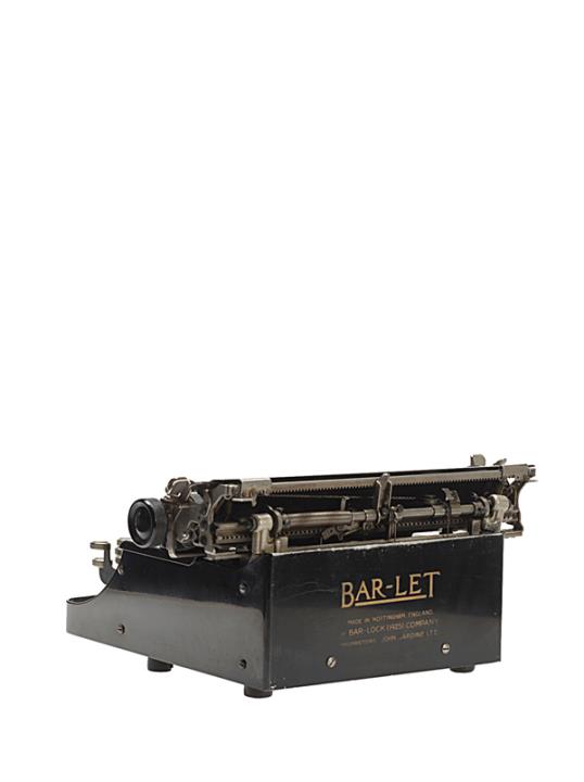 Schreibmaschine Bar-Let Modell 1 Eigenschaften: Typenhebel, Vorderanschlag, doppelte Umschaltung, Farbband Tastatur: universal, dreireihig, 28 Schreibtasten Konstrukteur: Franz Kraudzun Besonderheit: Nachfolgemodell der Schreibmaschine Mitex (Tell); aufklappbarer Wagen; war in mehreren Farben erhältlich, Seriennummer 2338