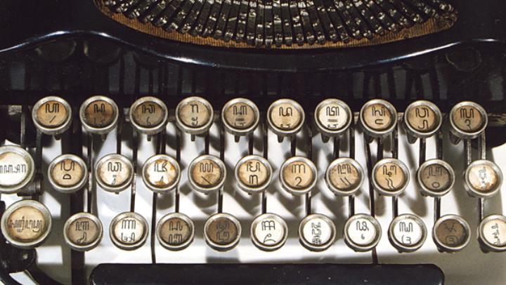 Schreibmaschine Adji Såkå (Meteor) Eigenschaften: Typenhebel, Vorderanschlag, doppelte Umschaltung, Farbband Tastatur: universal, javanisch (Hanacaraka), dreireihig, 30 Schreibtasten Konstrukteur: Maurer Besonderheit: es wird angenommen, dass diese Schreibmaschine aus dem Sultanspalast (Kraton) von Yogyakarta/Java stammt und im Auftrag der niederländischen Kolonialregierung für den damaligen Sultan Hamengkubuwono VII hergestellt wurde, Seriennummer 2350