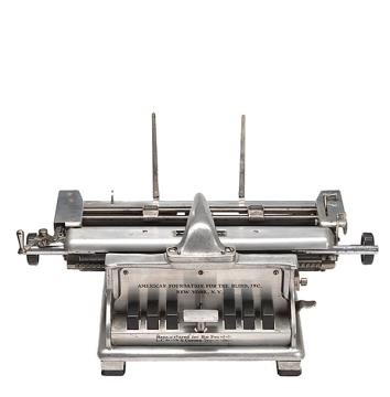 Blindenschreibmaschine der American Foundation for the Blind nach Vorbild des Hall Braille Writer Eigenschaften: Punktstifte (6-Punkt-Braille), 6 Punkttasten, Papierprägung im Unteranschlag Konstrukteur: Frank Haven Hall