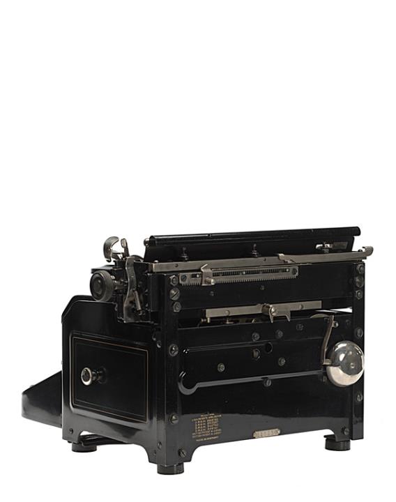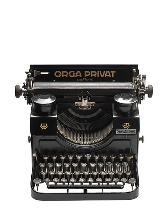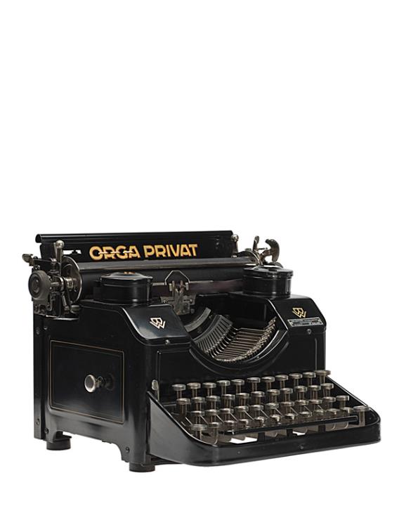 Schreibmaschine Orga Privat Modell 5 Eigenschaften: Typenhebel, Vorderanschlag, einfache Umschaltung, Farbband Tastatur: universal, griechisch, vierreihig, 42 Schreibtasten Konstrukteur: Ludwig Reischl, Seriennummer 115250