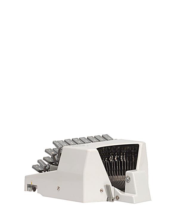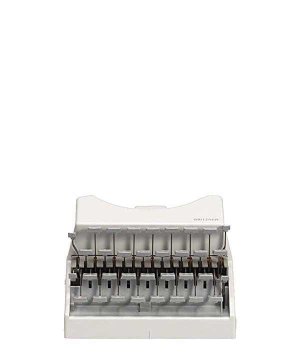 Beschriftungsmaschine Gritzner Typ 4-1002-021 Eigenschaften: Typenhebel, Oberanschlag, einfache Umschaltung, Farbröllchen Tastatur: universal, vierreihig, 30 Schreibtasten Besonderheit: auf einer Schiene laufend, wurde die Maschine vorrangig zur Beschriftung von Bauplänen verwendet, Seriennummer 016815