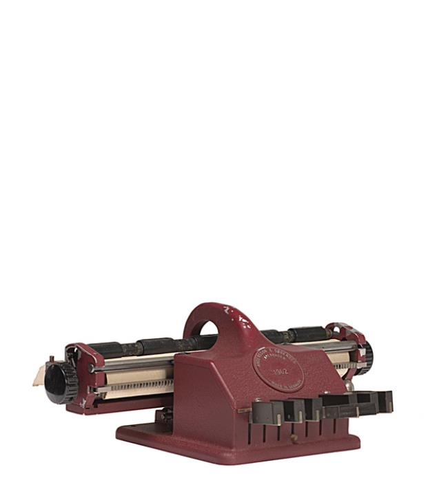 Blindenschreibmaschine Andersson & Sørensen Eigenschaften: Punktstifte (6-Punkt-Braille), 6 Punkttasten, Papierprägung im Unteranschlag Konstruktion: nach Picht, Seriennummer 1902