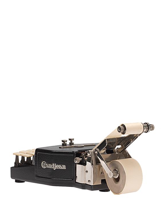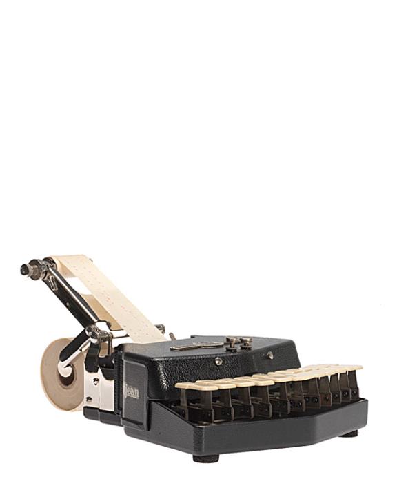 Stenografiermaschine Grandjean (Farbe schwarz) Eigenschaften: Typenhebel, Vorderanschlag, Farbband, klappbarer Papierrollenhalter Tastatur: zweireihig, 21 Tasten Konstrukteur: Marc Grandjean, Seriennummer 17774