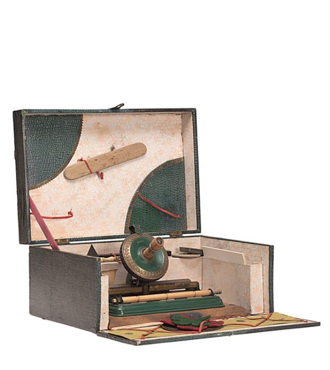 Kinderbüro im aufklappbaren Karton mit Schreibmaschine Eureka Inhalt: Zeigerschreibmaschine Eureka mit fotokopierter Bedienungsanleitung, Reinigungsbürste, 2 Lineale, Metalldose eckig, Radiergummi, Schreibfeder, Vierkantstab, Löschpapier, Filzblume, Holzspachtel, Papierblätter, Etiketten, 3 Fleißbildchen (französisch, Thema: Berufe)