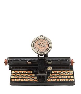 Schreibmaschine Dactylette Modell 1 Eigenschaften: Zeiger/Eintaster, Typenplatte (Halbmond), Großbuchstaben, Oberanschlag, Farbröllchen