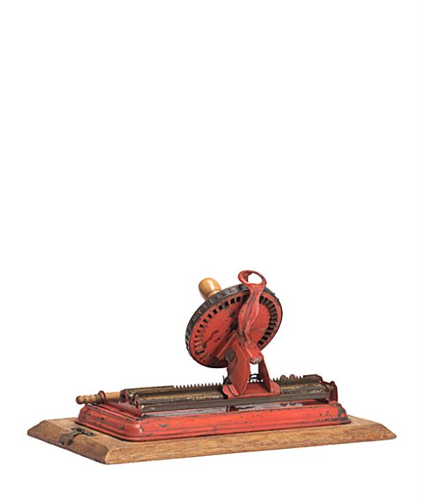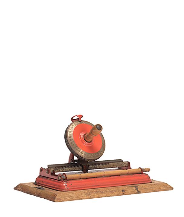 Schreibmaschine Euréka (Farbe orange) Eigenschaften: Zeiger/Eintaster, Typenrad, Großbuchstaben, Oberanschlag, Farbkissen (fehlt) Hersteller: K-B Paris / N. K. Atlas Paris Besonderheit: wurde unter der Bezeichnung Stollwerck (Aufschrift rund um den Drehknopf) vom gleichnamigen Schokoladenhersteller als Werbegeschenk verteilt andere Bezeichnung: la Francaise, American, Atlas Index