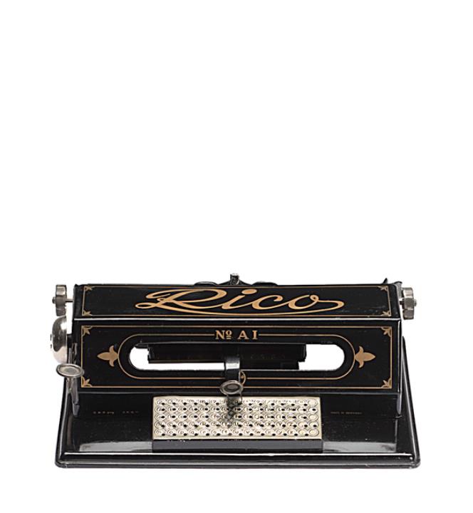Schreibmaschine Rico Modell A1 Eigenschaften: Zeiger, gebogene Typenplatte, Groß-/Kleinbuchstaben, Druckhammeranschlag, Farbbandstreifen (fehlt)