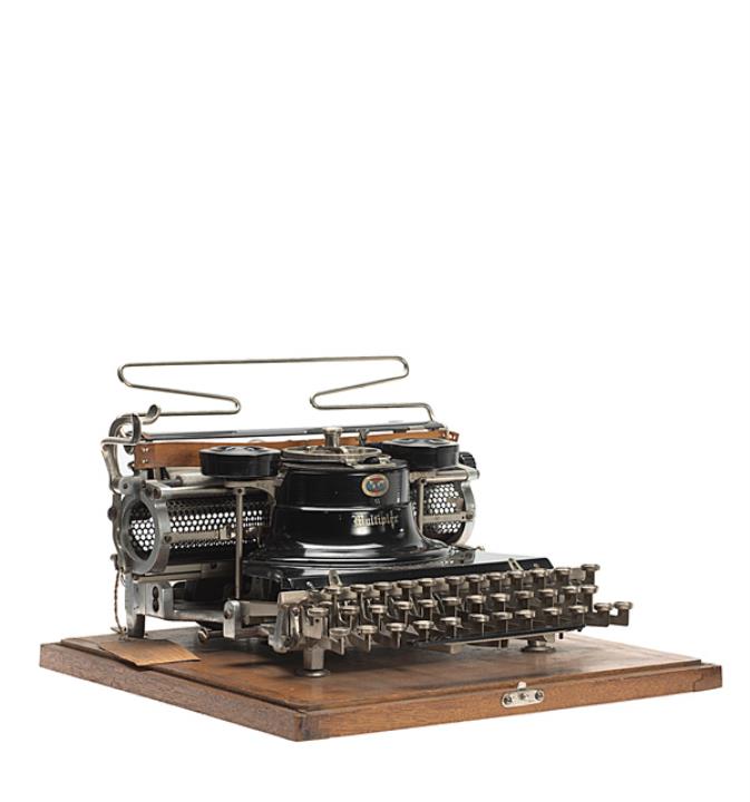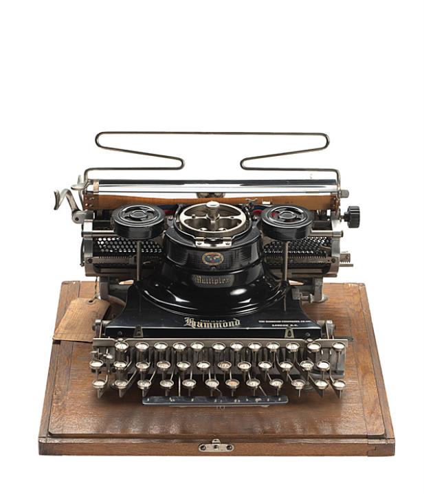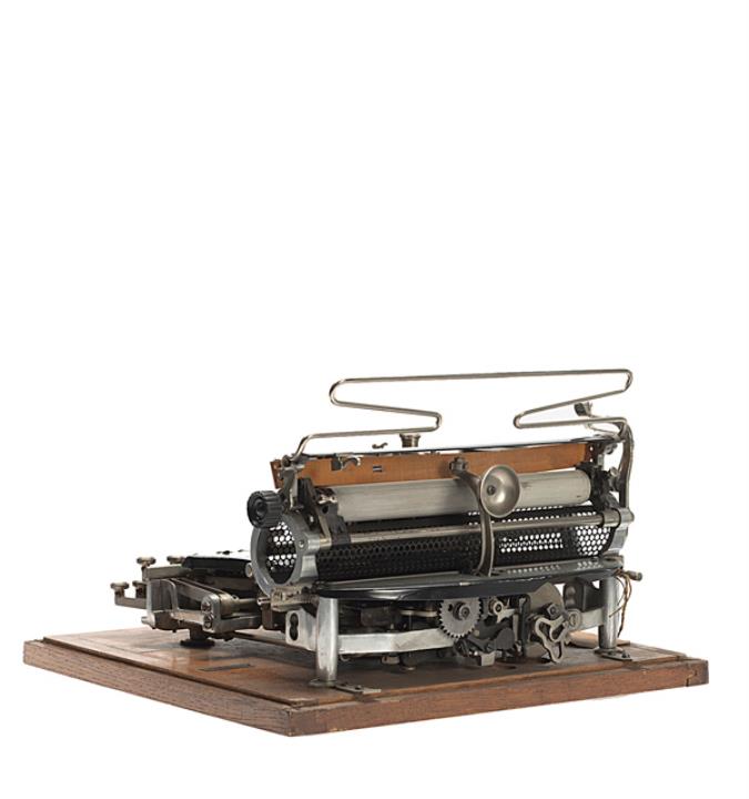 Schreibmaschine Hammond Modell Multiplex; auf Unterboden der Holzabdeckung montiert Eigenschaften: Typensegment, Druckhammeranschlag, doppelte Umschaltung, Farbband Tastatur: universal, dreireihig, 30 Schreibtasten Konstrukteur: James Bartlett Hammond Besonderheit: austauschbarer Typenträger; gleichzeitige Nutzung von zwei Schriftsätzen, Seriennummer 236644G2