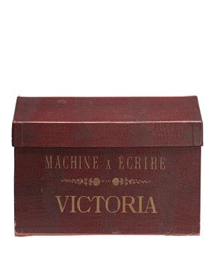 Kinderbüro im aufklappbaren Karton mit Schreibmaschine Victoria (Famos) Inhalt: Zeigerschreibmaschine Victoria, Lineal, 3 Metalldosen eckig, 3 Radiergummi, 2 Löschwiegen, 3 Tintenfässer, Brieföffner, Bleistift, Spitzmesser, Schreibfeder, Globus, Taschenkalender Jahr 1912, leere Schachtel für Stempel, Schachtel mit 3 Federn, 2 Filzblumen, Briefpapier und Briefumschläge Hersteller: W-CO Paris