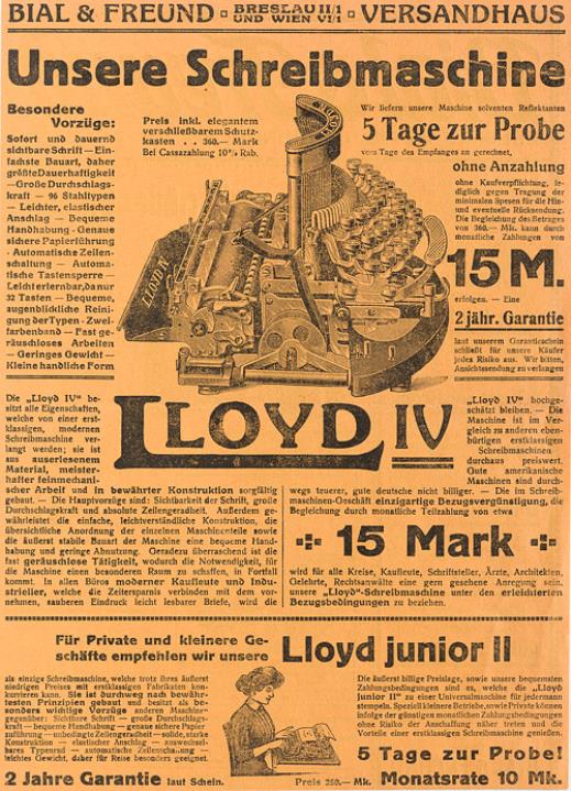 Werbeanzeige für Schreibmaschine LLoyd monochrom