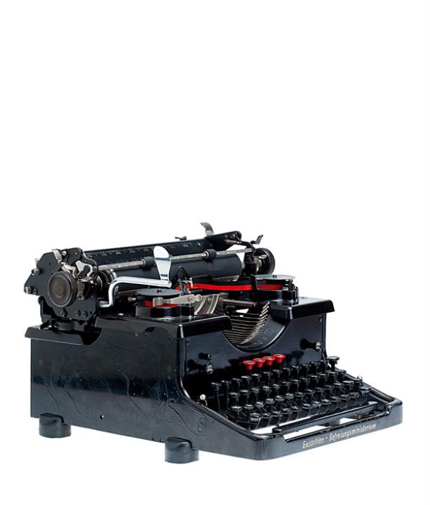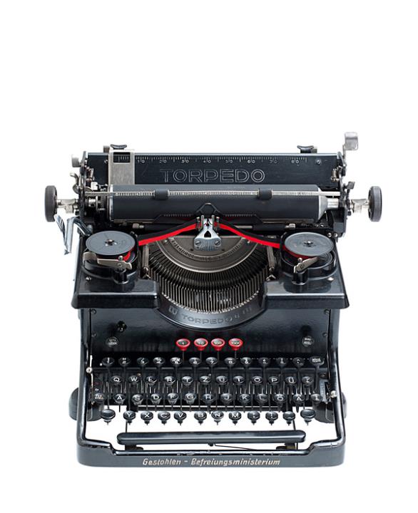 Schreibmaschine Torpedo Modell 6 Eigenschaften: Typenhebel, Vorderanschlag, einfache Umschaltung, Farbband, Tabulator, Anschlagstärke-Regler Tastatur: universal, vierreihig, 46 Schreibtasten Konstrukteur: Calr Winterling, Herbert Etheridge Besonderheit: nachträgliche Gravur "Gestohlen - Befreiungsministerium", Seriennummer 141762