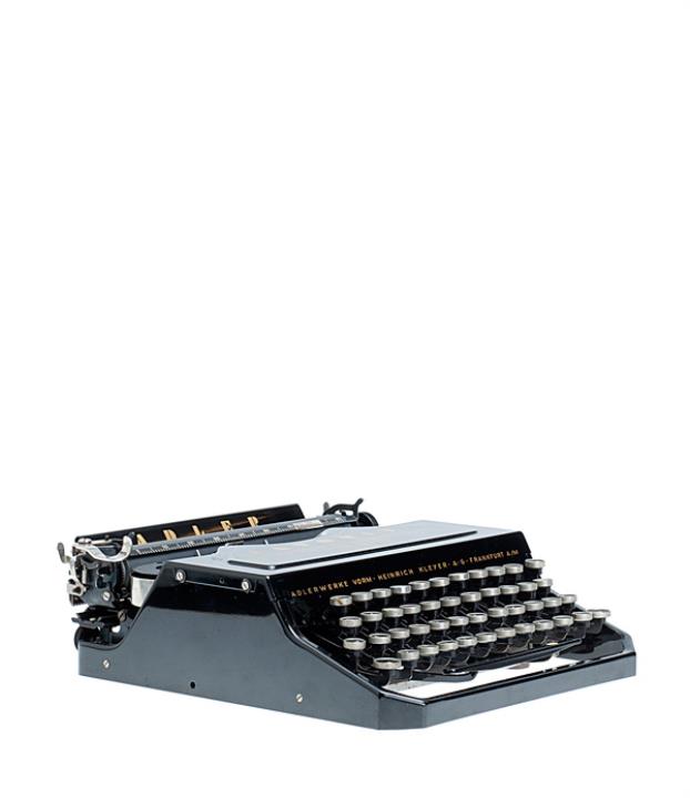 Schreibmaschine Adler Modell Favorit Eigenschaften: Typenstangen, Vorderanschlag, einfache Umschaltung, Farbband, Tabulator Tastatur: universal, vierreihig, 42 Schreibtasten, Seriennummer 489453