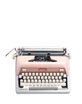 Schreibmaschine Royal Modell Futura 800 (Farbe grau/rosa) Eigenschaften: Typenhebel, Vorderanschlag, einfache Umschaltung, Farbband, Tabulator Tastatur: universal, vierreihig, 44 Schreibtasten Design: Laird Fortune Covey