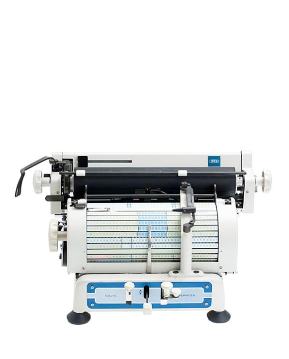 Japanische Schreibmaschine Kokuyo Modell TW-3112 Eigenschaften: Zeiger, bewegliche Typentrommel mit 36x39 Einzeltypen (Kanji/Lateinisch), Vorderanschlag, Karbonband, Seriennummer 120136