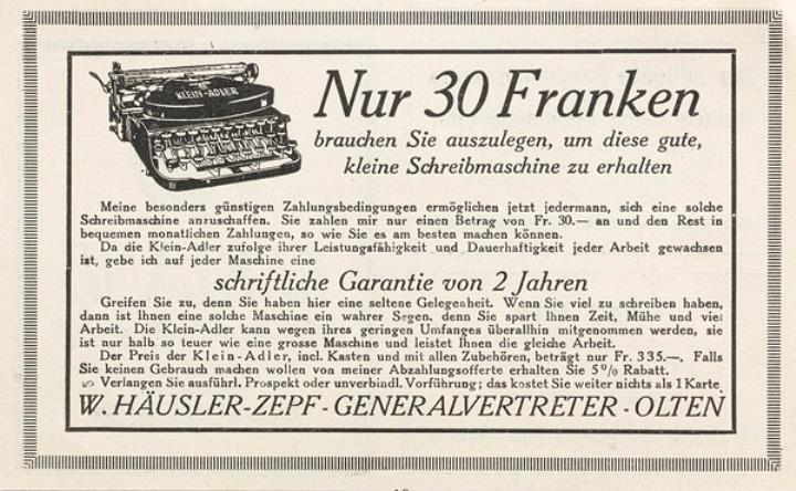 Werbeanzeige für Schreibmaschine Klein-Adler monochrom