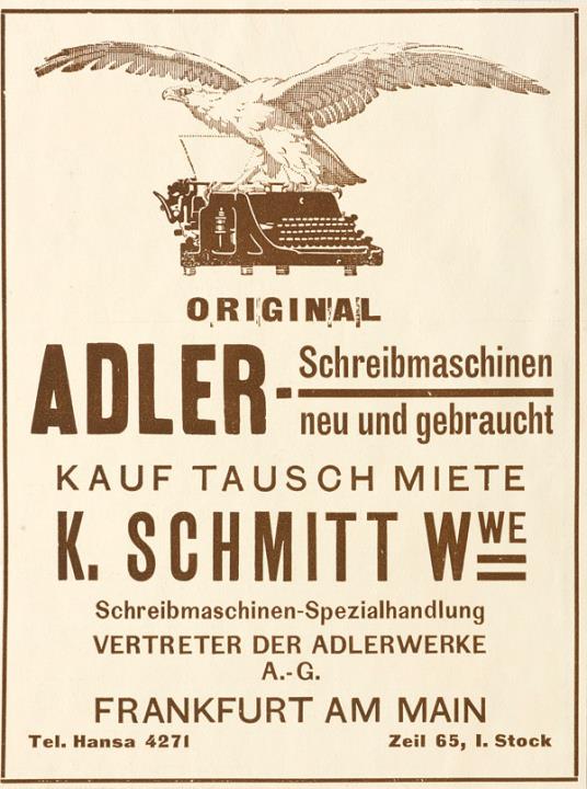 Werbeanzeige für Schreibmaschinen-Spezialhandlung K. Schmitt Wwe. monochrom