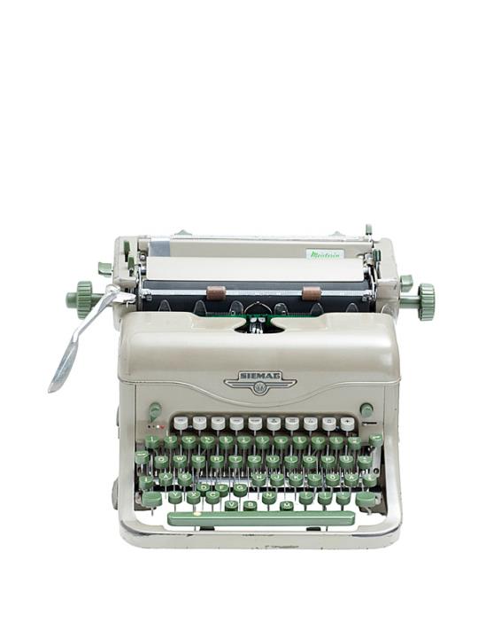 Schreibmaschine Siemag Modell Meisterin Eigenschaften: Typenhebel, Vorderanschlag, einfache Umschaltung, Farbband, Dezimaltabulator Tastatur: universal, fünfreihig, 46 Schreibtasten, Seriennummer 092523
