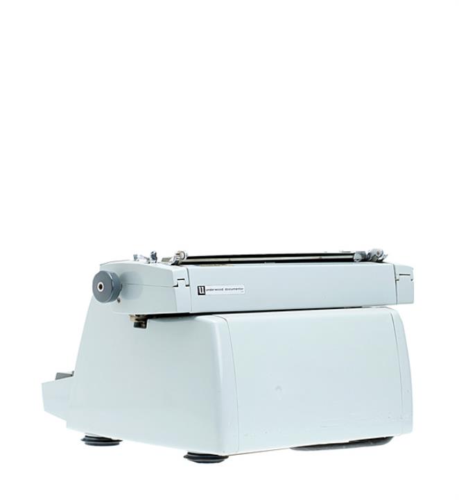 Elektrische Schreibmaschine Underwood Modell Documentor Eigenschaften: Typenhebel, Vorderanschlag, einfache Umschaltung, Farbband, Tabulator, Elektromotor Tastatur: universal, vierreihig, 44 Schreibtasten, "Gold Touch", Seriennummer E13-8434532
