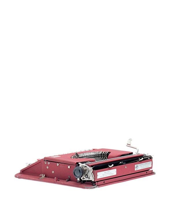 Schreibmaschine Gossen Modell Tippa (Farbe rot); auf Unterseite des Tragekoffers montiert Eigenschaften: Typenhebel, Vorderanschlag, einfache Umschaltung, Farbband Tastatur: universal, vierreihig, 43 Schreibtasten Konstrukteur: Erwin Pfaffenberg, Seriennummer 13622