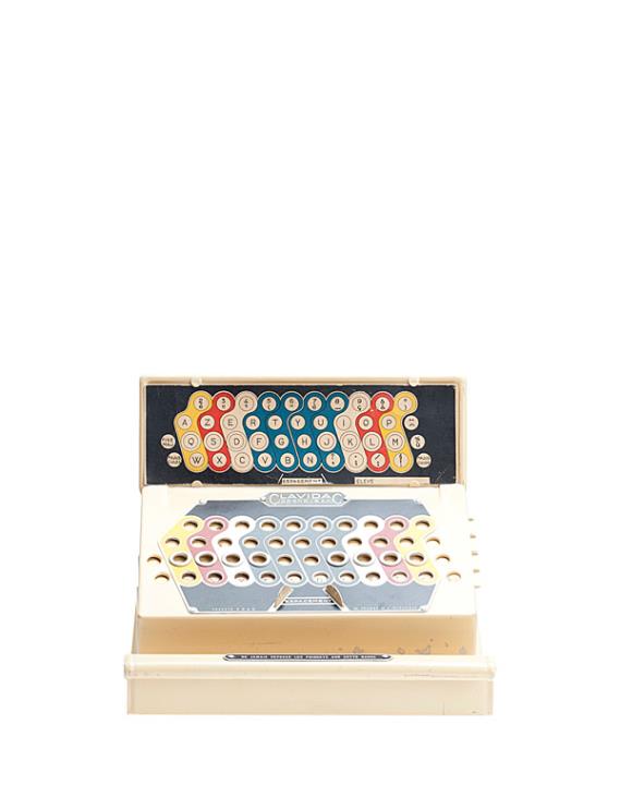 Übungstastatur Clavidac zum Erlernen der Blindschreibmethode Eigenschaften: Tastatur vierreihig, 42+3 Vertiefungen anstelle der Tasten, seitliche Schlitze zum Einschieben von Buchstabenstreifen, aufklappbarer Deckel mit Schautafel