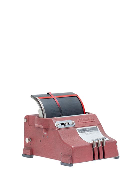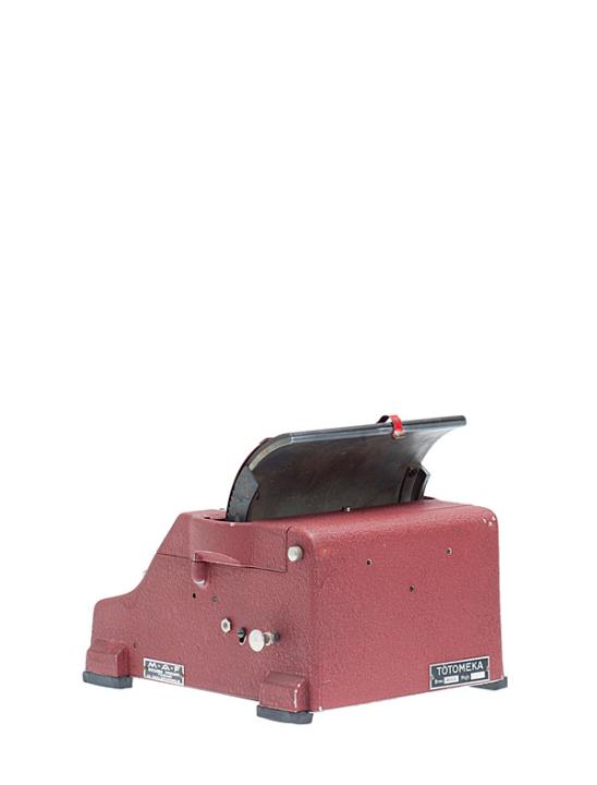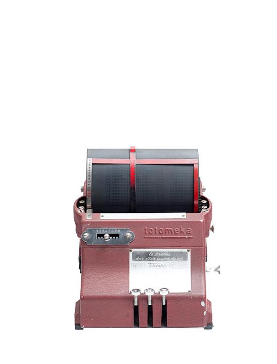 Schreibmaschine/Stempelmaschine für Wettscheine (totocalcio) Totomeka Eigenschaften: Farbband, Vorderanschlag, 3 Tasten, 8fach-Regler, mobiler Papierscheinhalter, Aufkleber mit Bedienungsanleitung, Seriennummer 2179