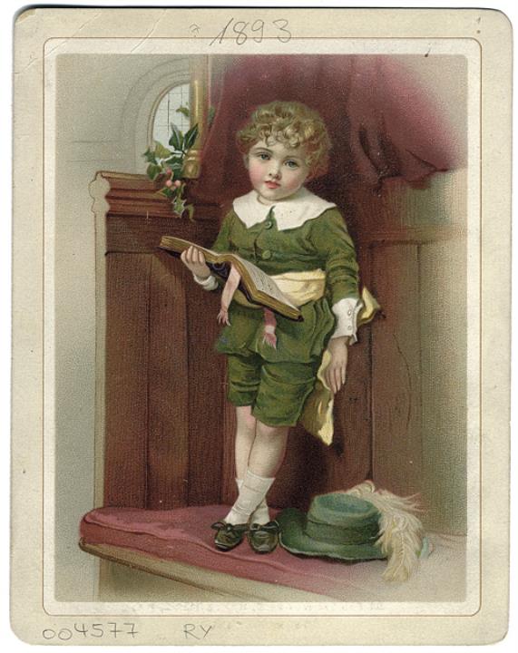 Sammelkarte mit Schreibmaschine Daugherty Rückseite: Bild eines modisch gekleideten Jungen (viktorianischer Stil)