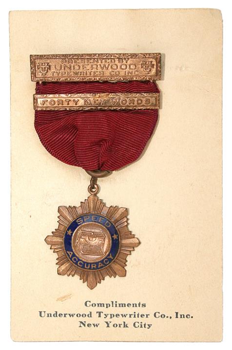 Brosche/Abzeichen für Schnellschreibkenntnisse auf der Schreibmaschine Underwood Text: Presented by Underwood Typewriter Co. Inc. - Forty Net Words