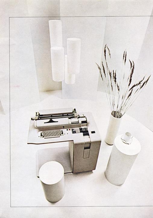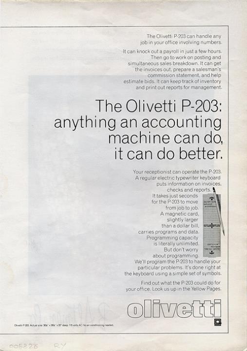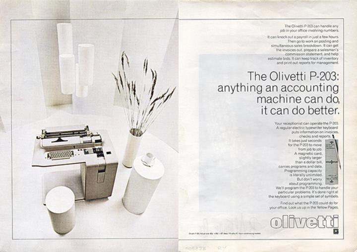 Zweiseitige Werbeanzeige für Computerschreibmaschine Olivetti P 203 polychrom