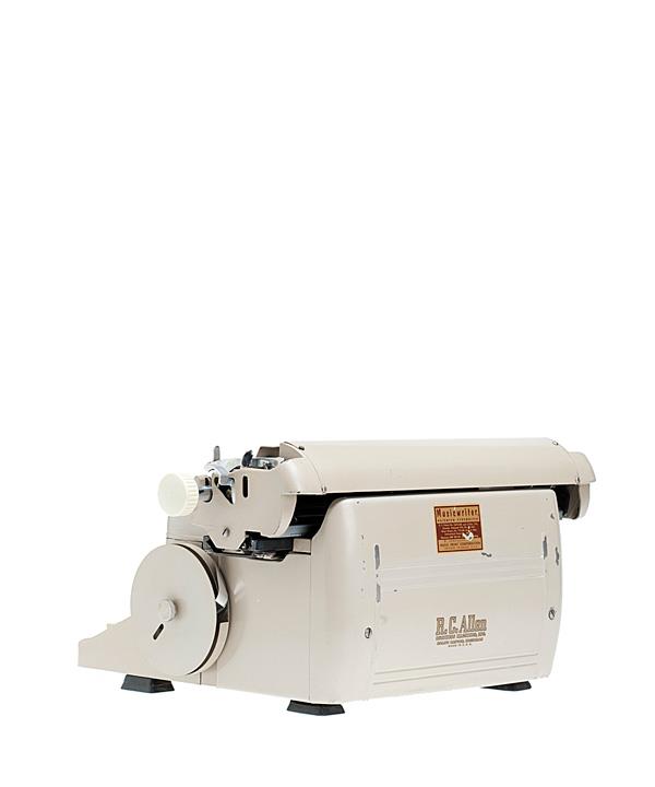 Schreibmaschine R.C. Allen Modell Musicwriter Eigenschaften: Typenhebel, Vorderanschlag, einfache Umschaltung, Karbonband Tastatur: Musiknotationszeichen, vierreihig, 44 Tasten Konstrukteur: Cecil S. Effinger, Seriennummer AC-2239178-14